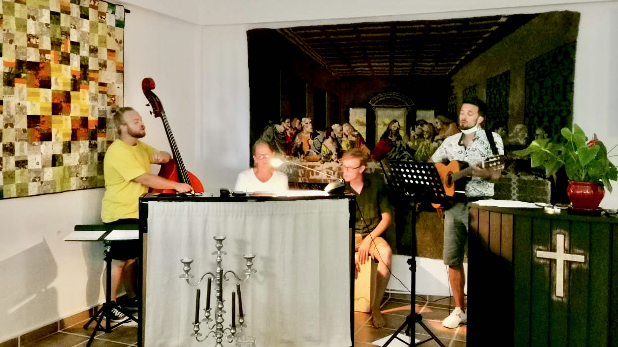 Så altså, gode grunnar til å både spela og syngja! Men, problemet her i Spania, som mange andre stader, er avgrensingane i kor mange som kan samlast per kvadratmeter innandørs. Med dei reglane som gjeld i skrivande stund har me lov å vera maksimalt 13 personar i møtesalen her på Centro Sarepta. Me ville likevel utnytta dette fullt ut, og fylte møtesalen til randa – i coronaforstand. Trass i det, var det mange fleire me så gjerne ville ha invitert med oss, så me satsar på at det kan bli fleire liknande samlingar i framtida!